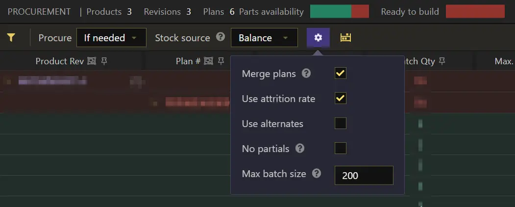 When handling procurement, the automatically created production builds can now have a max batch size. All procurement options are now accessible through a button and tooltip (as seen below).