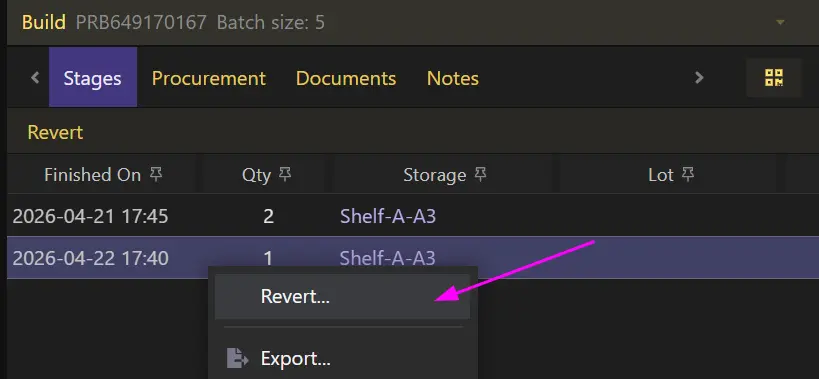 If a partial quantity is finished, a build stage is created, which can be accessed through the production build's details tab (see below). From there you can see how many stages the production build has been through and the quantities finished (i.e. produced) in each stage. You can also revert any of these stages.