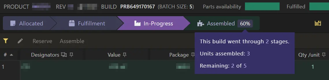 When a production build has been partially finished, the Assembled status on the progress bar will indicate its completion status (percentage).