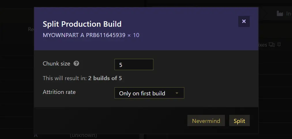 When splitting a production build you can also indicate if the chunks should use attrition rate, don't use at all, or to use attrition only on the first chunk.